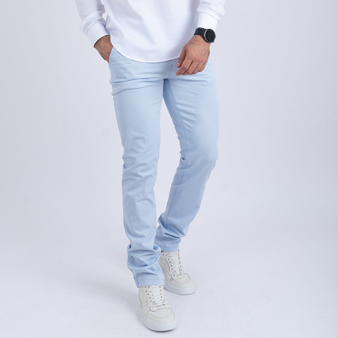 Pantalon bleu ciel pour homme au style épuré et estival. Coupe ajustée, tissu doux et confortable. Idéal pour un look casual chic.
