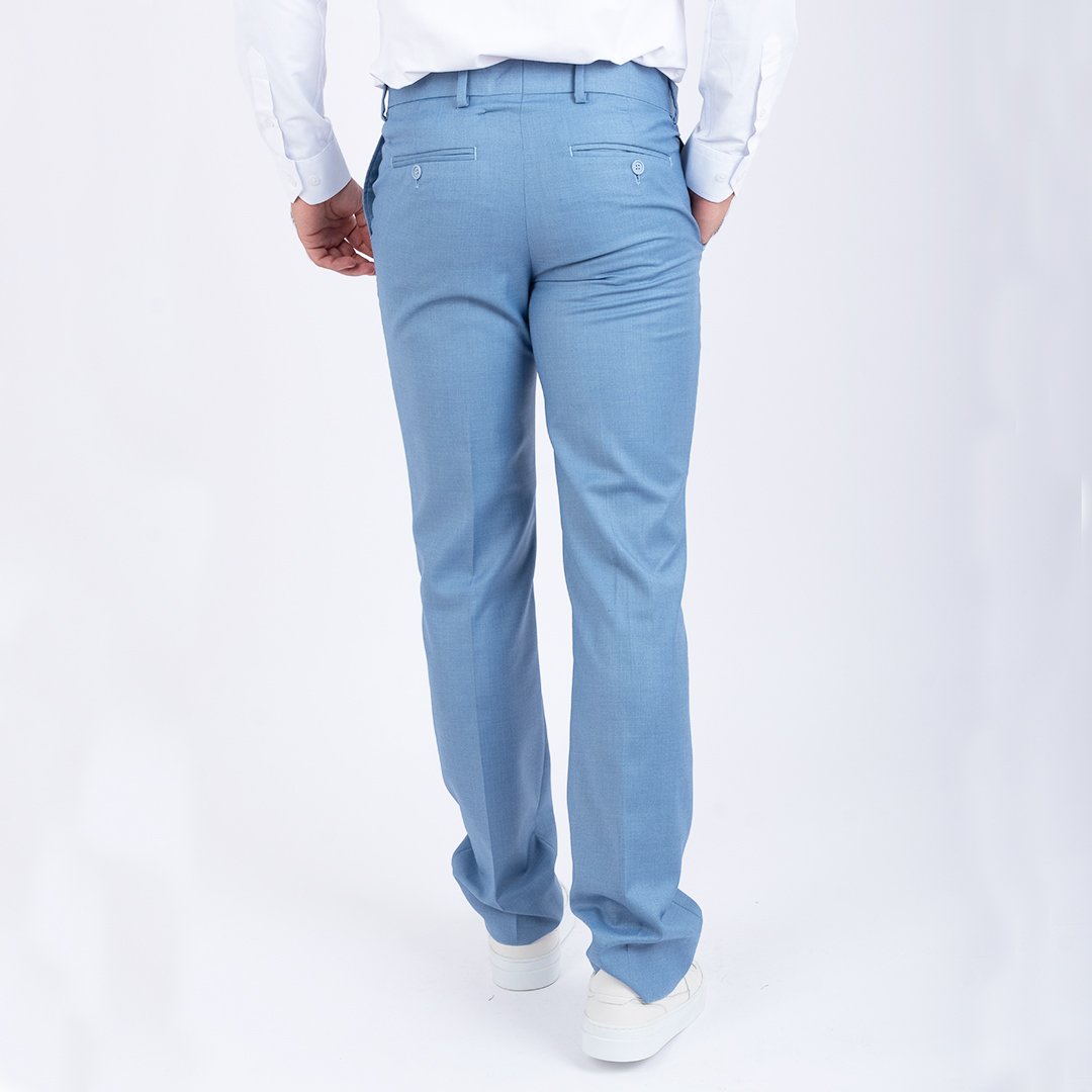 La coupe du pantalon tergal bleu clair a été spécialement pensée pour mettre en valeur la silhouette masculine tout en garantissant un confort maximal.