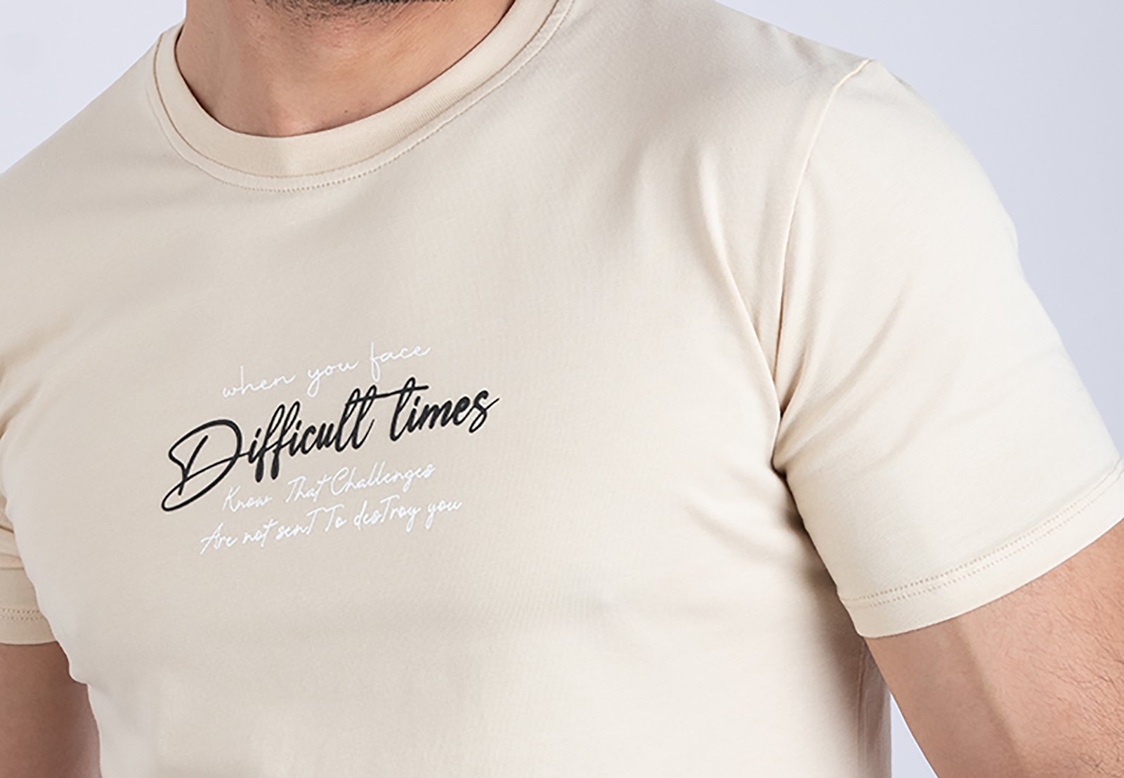Exprimez votre style avec simplicité grâce à ce t-shirt imprimé pour homme en coloris beige clair. Son message graphique “Difficult Times” apporte une touche personnelle et moderne, idéale pour un look casual maîtrisé.