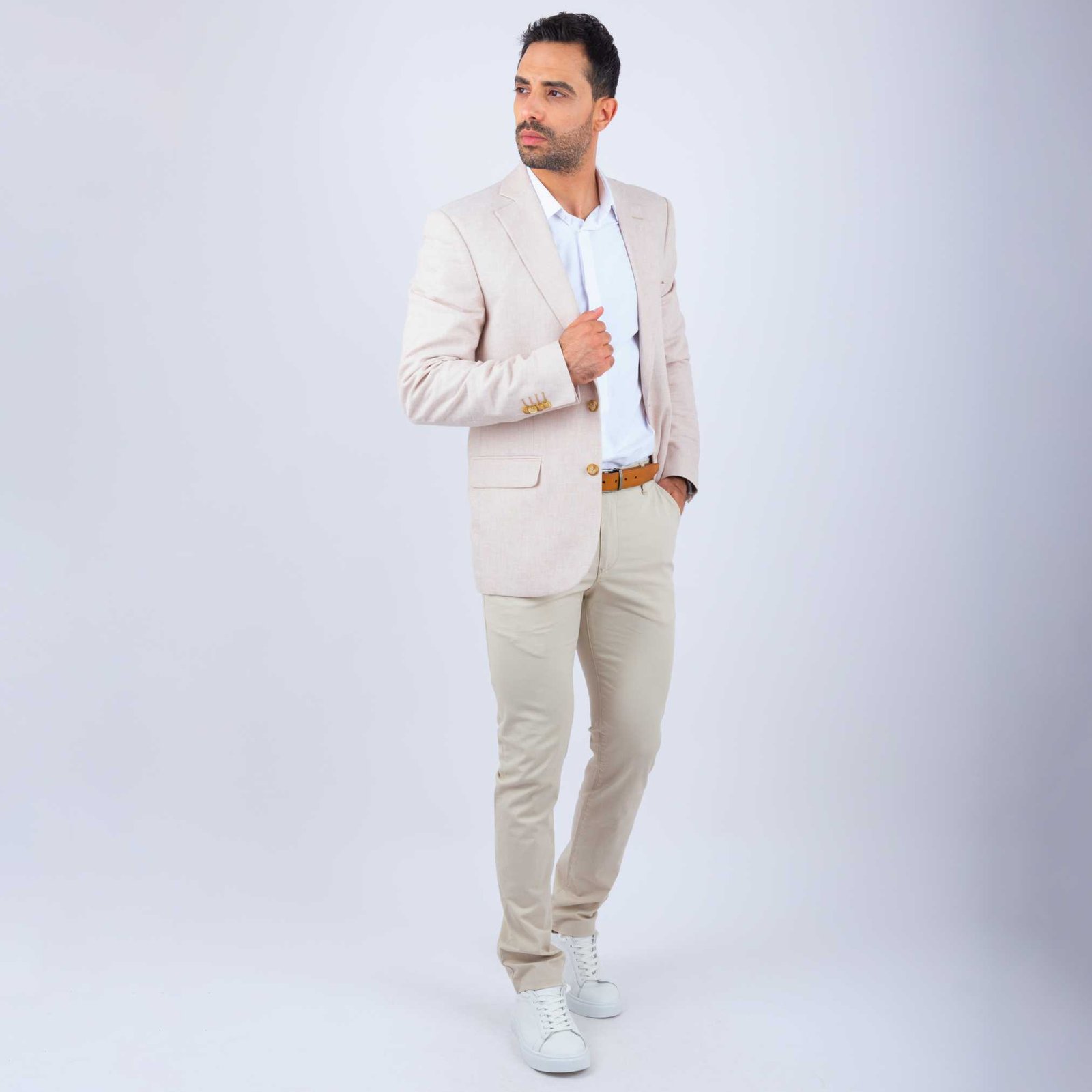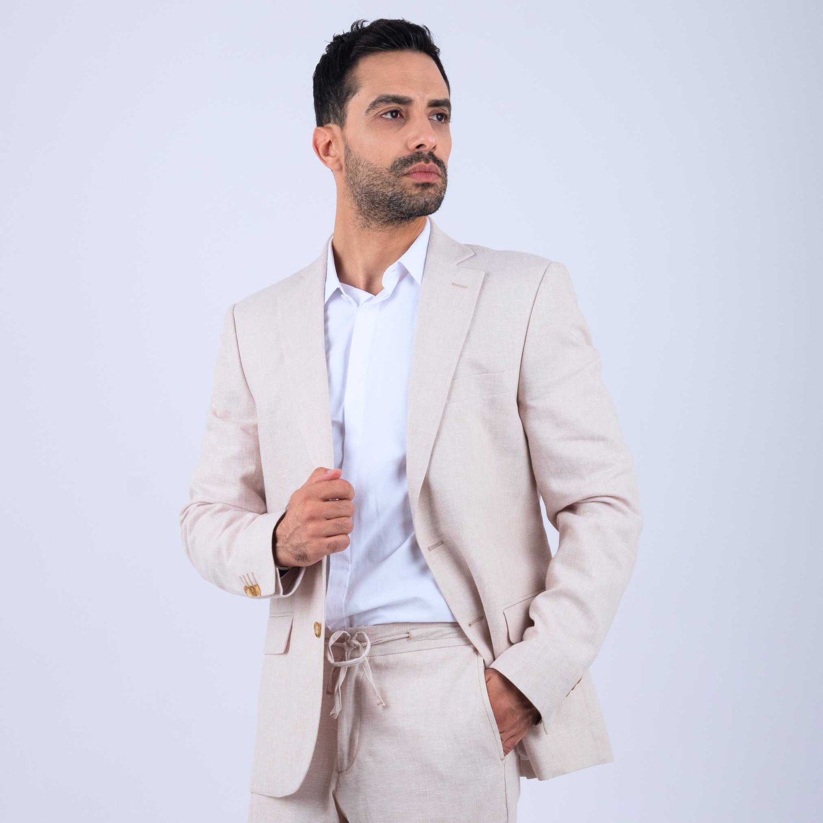La veste homme lin beige convient à toutes les morphologies et apporte immédiatement un style soigné.